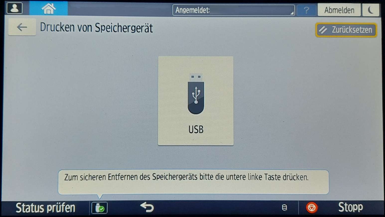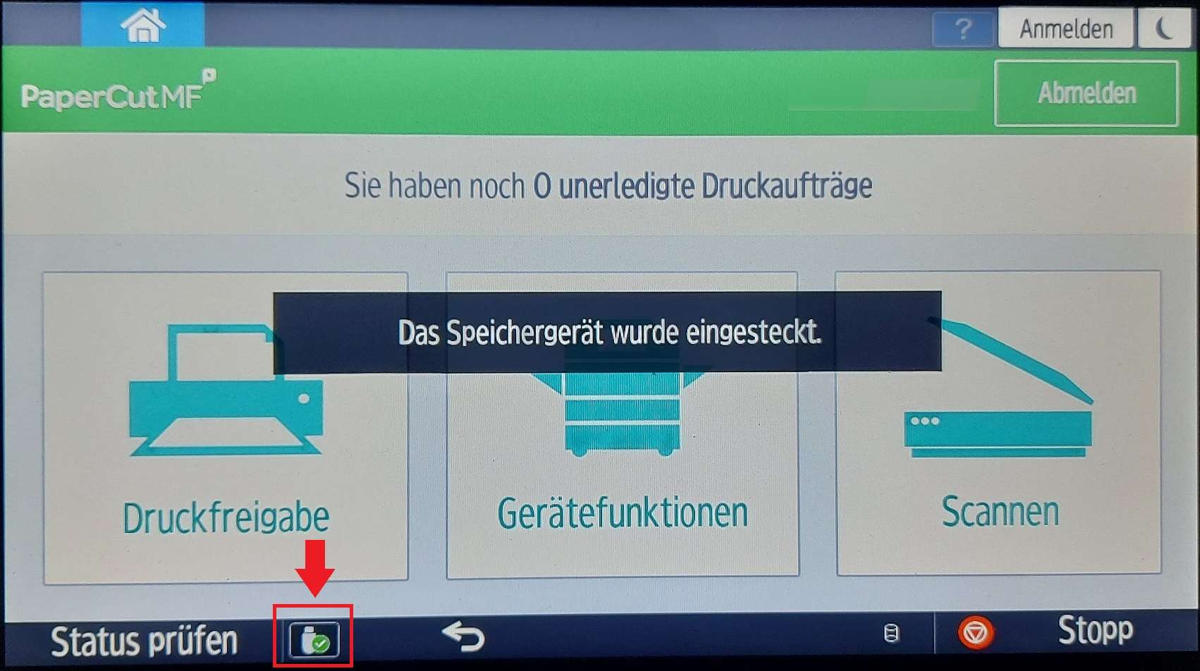 Auf der Benutzeroberfläche sehen Sie am unteren Rand das Symbol für den eingesteckten USB-Stick.