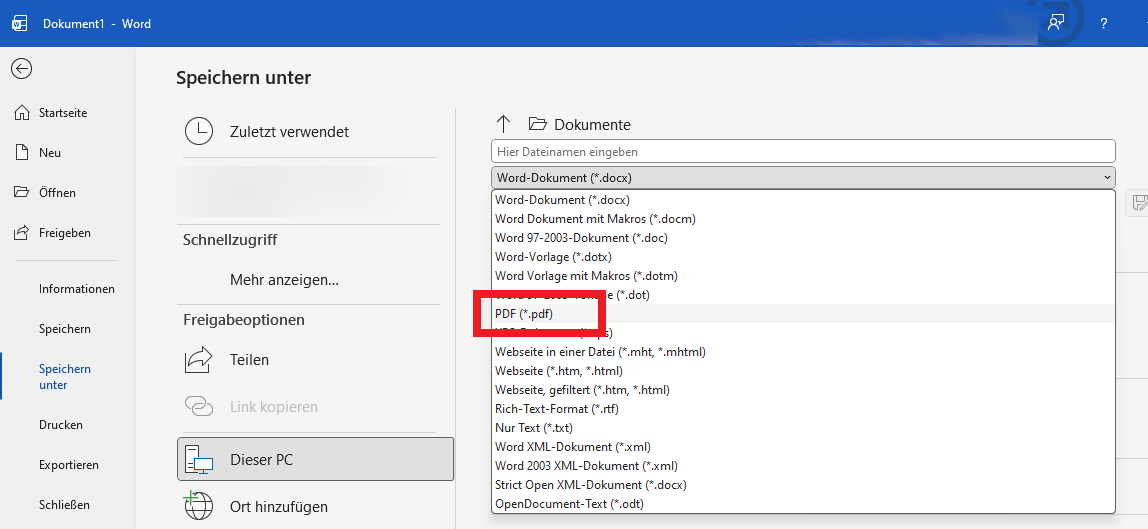 Wenn Sie über Word eine Datei umwandeln möchten, gehen Sie auf Datei > Speichern unter und wählen Sie PDF aus.