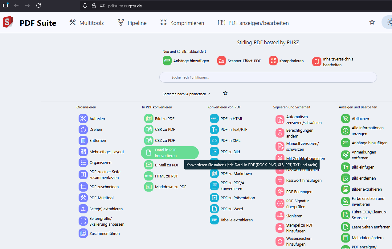 Über die zur Verfügung gestellte, webbasierte Anwendung PDFSuite kann ohne Installation mit einem üblichen Browser die gängigsten PDF Funktionalitäten genutzt werden. Die PDFSuite ist dabei nur aus dem RPTU Netz (VPN) aufrufbar.