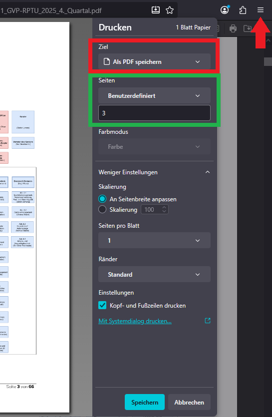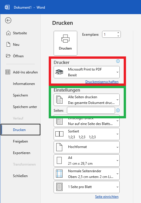 Möglich ist auch über Datei > Drucken den Ausdruck als PDF zu speichern.