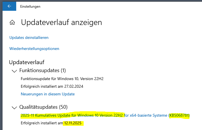 Unter "Updateverlauf anzeigen" können Sie bspw. nach dem Update KB5068781 suchen, welches für das kumulative Windows 10 Update für Version 22H2 vom November Patch 2025 steht.