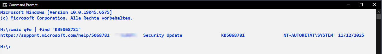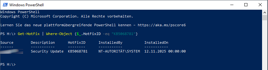 Get-HotFix | Where-Object {$_.HotFixID -eq "KB5068781"}überprüfen, ob das Sicherheitsupdate eingespielt wurde.